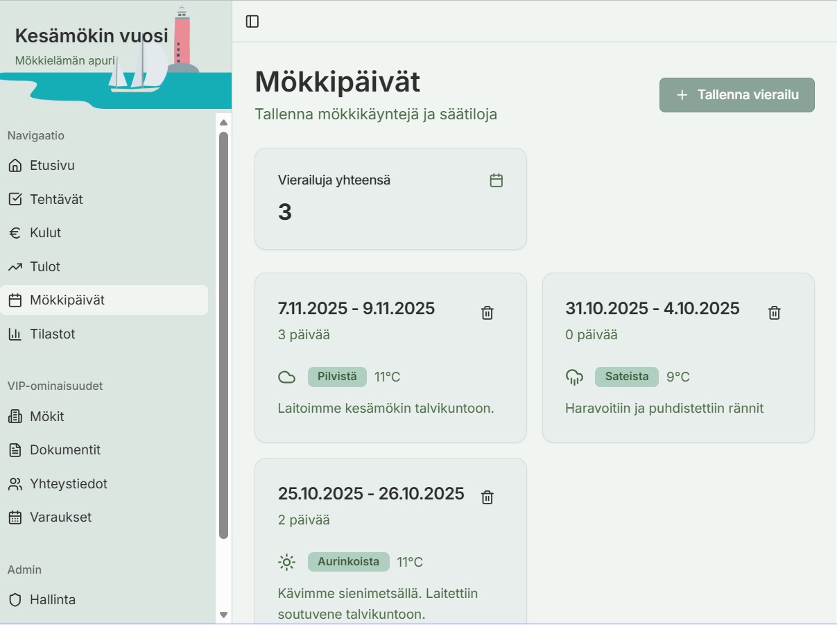 Mökkipäivät-näkymässä voit tallentaa mökkikäynnit, säätiedot ja omat muistiinpanosi – kuten "laitettiin vene talvikuntoon" tai "haravoitiin pihamaa".